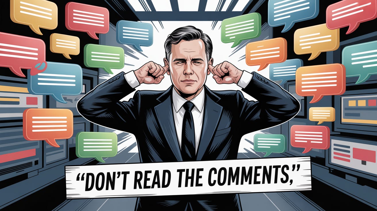 The phrase "don’t read the comments" is now a mantra of elite culture. It's often meant as self-care, but it doubles as a tactic of disengagement. It implies that online discourse is toxic by default, and that those who participate are unworthy of attention.